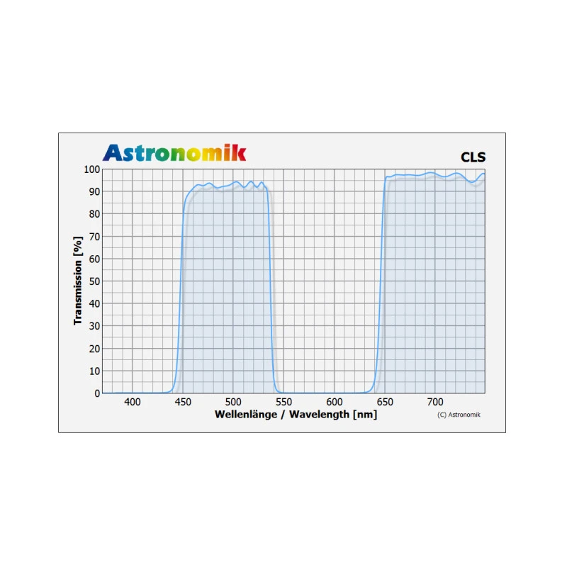 - As a first filter, we recommend the Astronomik CLS filter. This filter suppresses artificial light pollution and natural airglow. By using this filter you get a dark-sky background and can therefore use much longer exposure times to make fainter objects visible. The filter is optimised in such a way that objects are reproduced in their natural colours. Important: the simple CLS filter has no built-in IR-blocking. Therefore you will need the CLS-CCD filter for an astro-modified camera!
