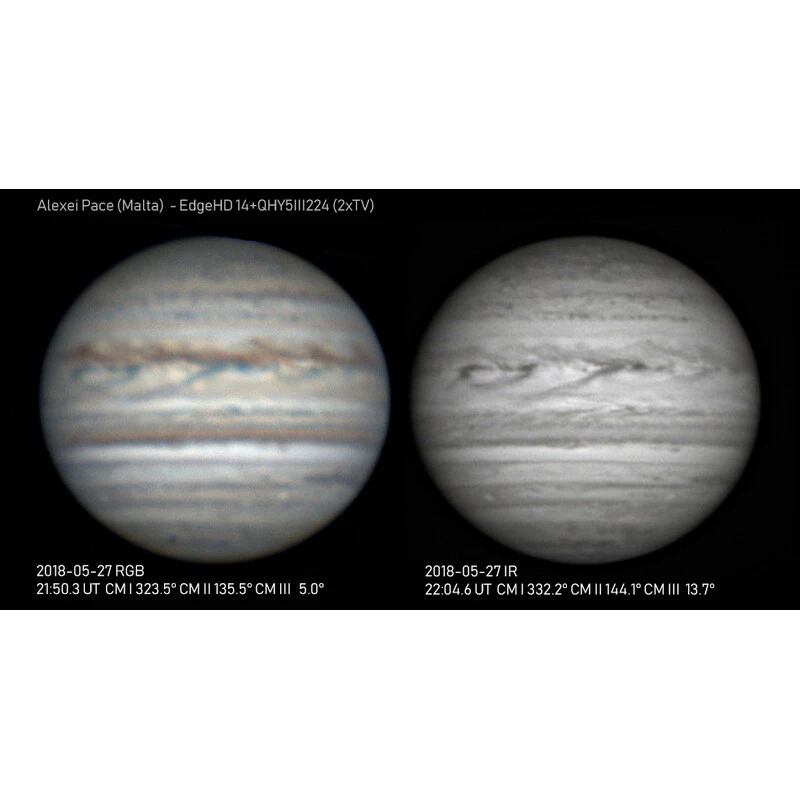 The Astronomik ProPlanet IR 742 cuts off the visible part of the spectrum and allows the light of wavelengths longer then 742nm to pass. Due to this behavior the part of the spectrum that is most sensitive to bad seeing is rejected. This approach does a big improvement to the imaging of planets and the moon. The image is more steady than the image in the visible light with nearly identical exposure times.
