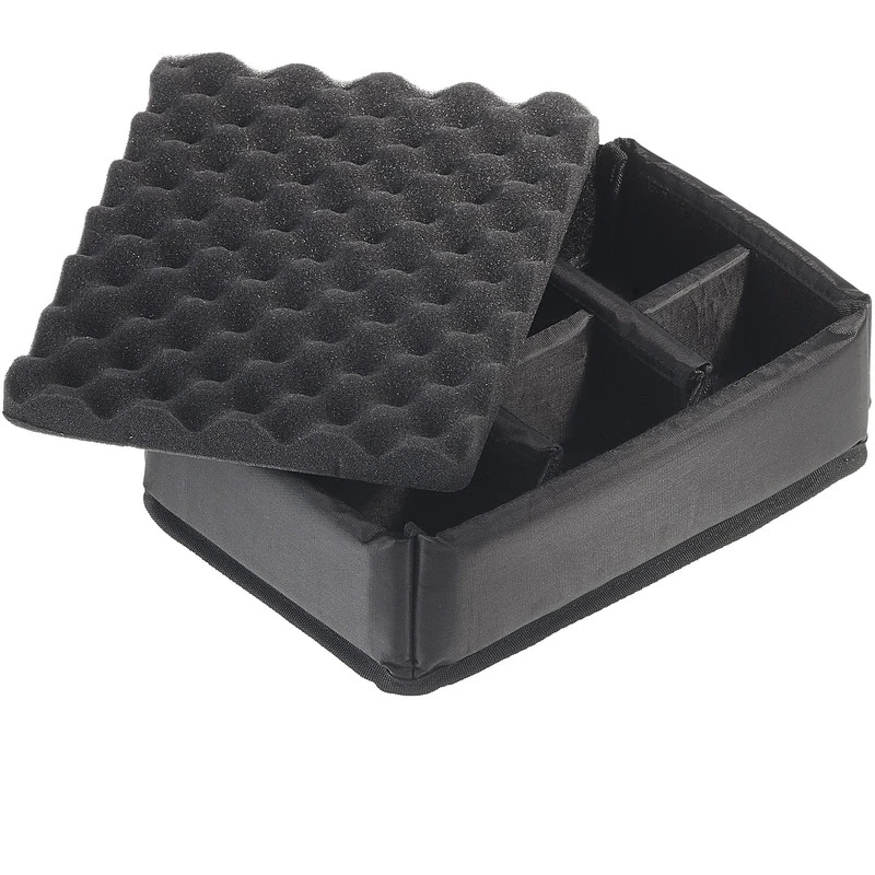 fully configurable padded partition insert made of washable, heavy duty nylon fabric with hook-and-loop attachements, robust egg-crate foam in the lid.