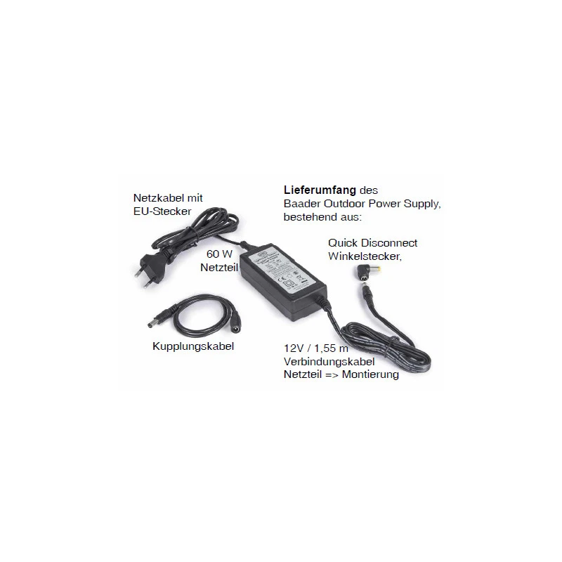 The casing is sealed against moisture. With a continuous load of 5A and an off-load voltage of at least 12V, the Baader Planetarium 60W Outdoor Power Cable is ideal for modern, high-torque mounts, such as the Celestron Advanced VD, CGEM (DX), CGE Pro and CPC HD Deluxe mounts. Of course, it is also suitable for all other mounts requiring a 5 amp power supply and a 12V 5.5mm/2.1mm DC connector.