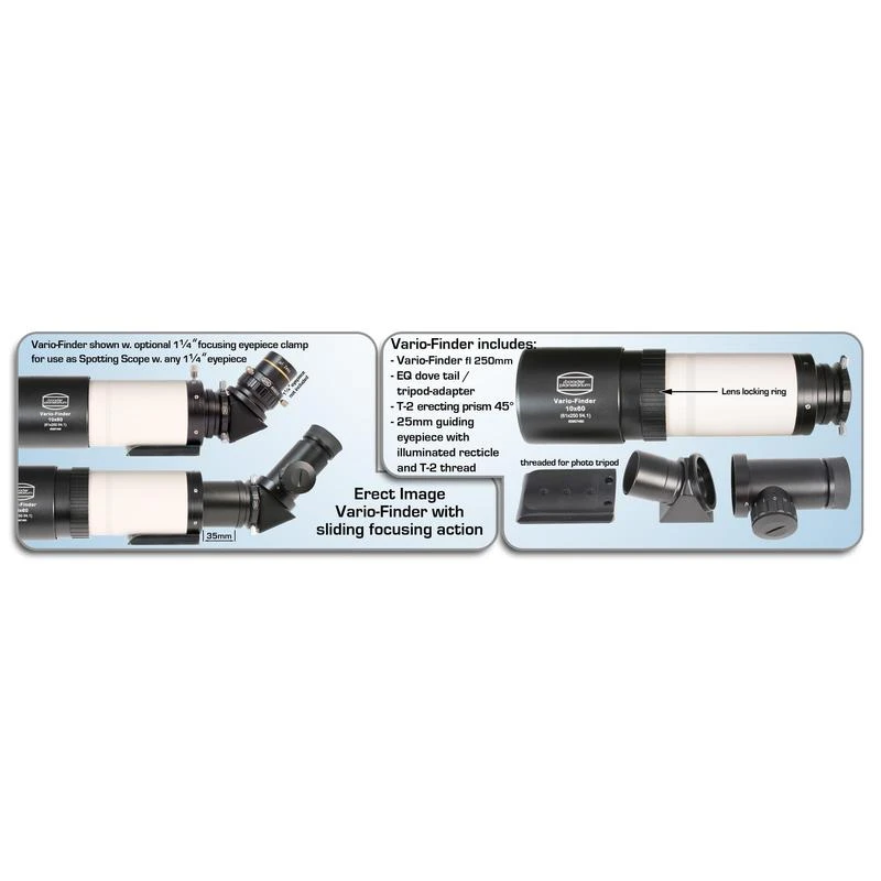 The Vario Finder is extremely versatile, offering numerous possibilities for the adaptation of accessories. Standard astronomy eyepieces can be used with the 1.25 inch connection. The 1.25 inch Amici prism can be used to enjoy excellent nature watching. It also provides comfortable astronomical observing. The finder set also includes a 25mm eyepiece with an illuminated reticule. The T-2 thread also allows connection to other T-2 accessories.