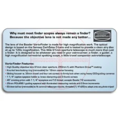 This finder scope can be used for locating celestial objects. This is what finders are known for, but the Baader Vario finder is much more. It can also be used as a guide scope, a spotting scope for nature watching or as a small astronomical travel companion telescope. The Baader Vario Finder is specifically intended for use at higher magnifications. The optical design has been developed around the famous Carl ZEISS C lens. This small telescope shows clear Airy discs even up to the 120X magnification.