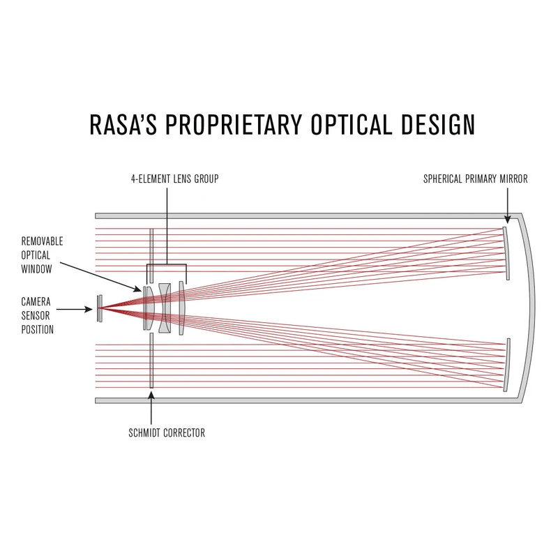RASA stands for Rowe-Ackermann-Schmidt Astrograph – Dave Rowe and Mark Ackermann are renowned optical instrument designers. Together, they hold numerous patents on their inventions. The RASA astrograph combines their expertise and experience.