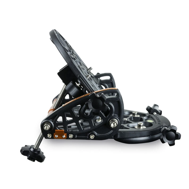 A polar wedge is required for the equatorial operation of a fork-mounted telescope. It is the connecting link between the tripod and the fork mount and is adjusted to the latitude of your observing location. The wedge prevents frame rotation and allows long-term exposures.