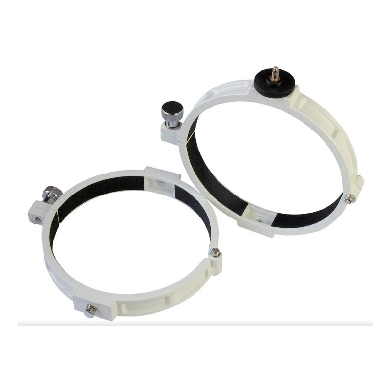 The Rings are felt-lined and hinged for easy installation of the telescope. By loosening the thumbscrews, the telescope can be easily balanced and rotated.