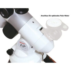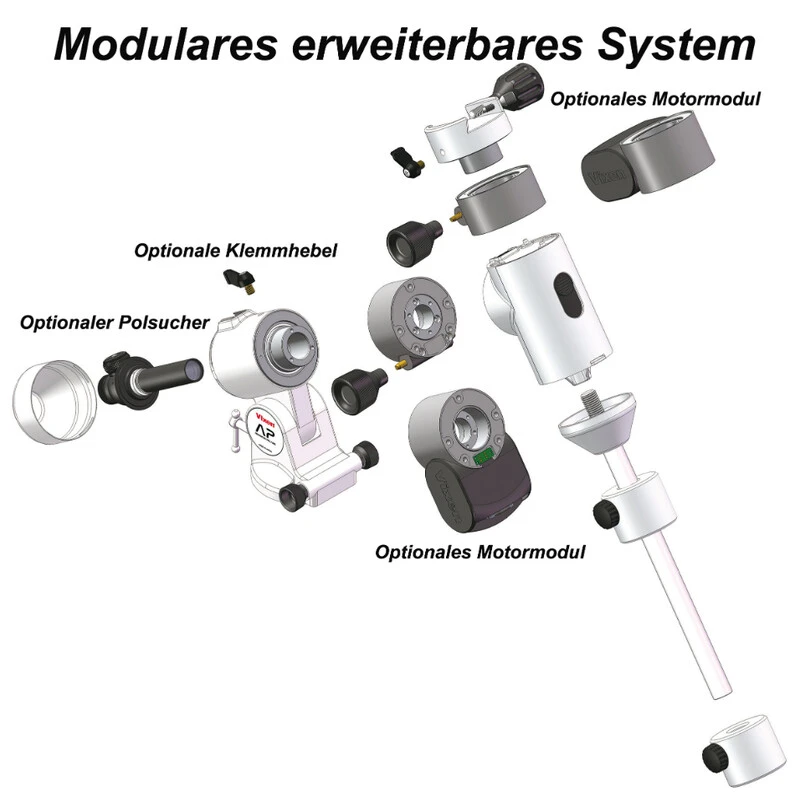 In order to align the mount to the north, you can use either a polar finder scope, or the compass of the of the Vixen Polarie photo mount. The Advanced Polaris has connectors for both options. The compass has the advantage that you do not need to bend down under the mount, and also don’t need a view of the Polar Star for alignment. The polar finder and compass can be found under “recommended accessories”. In summary: thanks to the extensive accessories available, the mount can be enhanced to suit all your needs.
