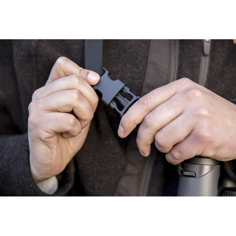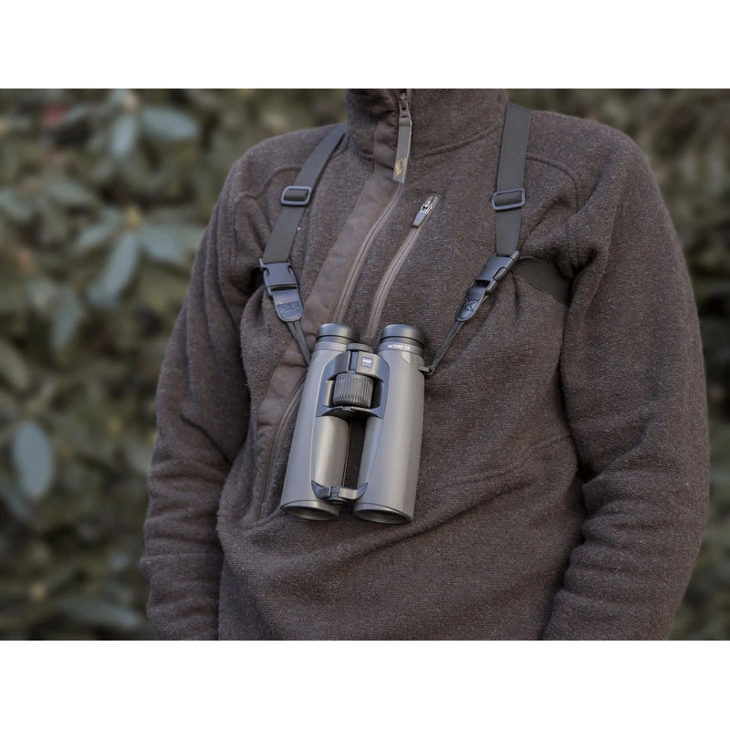 Binoculars are one of the most important parts of a hunter’s equipment. Whether you are targeting game from a high vantage point, on a hunting trip or stalking game, having your binoculars within easy reach is essential for hunting success. The new binoculars comfort carrying strap from ZEISS ensures that your binoculars are always exactly where you need them: around your neck and on your chest. Its special features include easy, practical fixation of the binoculars and outstanding wearing comfort. Compared to simple carrying straps, the new strap from ZEISS allows you to carry your binoculars in total comfort. It is made of high-quality materials and feels pleasant on your skin. The high-quality workmanship prevents neck strain and distributes the weight of the binoculars over your upper body. The binoculars remain steady and do not swing in various directions when you are moving about. The strap length can be adjusted to meet the need of a wide range of applications. The binoculars are connected by feeding a strap through the brace eyelet. This type of connection is particularly quiet and prevents damage to the binoculars. Quick-release fasteners allow you to attach and detach the carrying strap extremely fast. For added convenience: the ends remaining on the binoculars can be connected to form a strap, allowing you to hold the binoculars more securely, also when you are not carrying them around your neck.