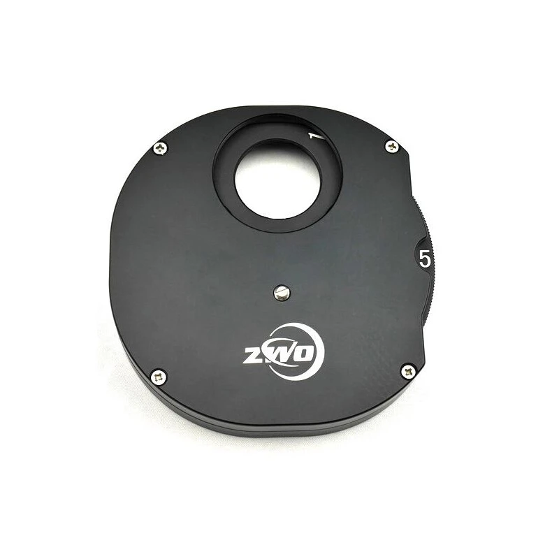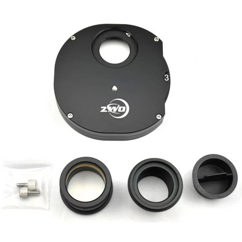 The filter wheel has the capacity for five 1.25″ filters. It comes with adapters allowing you to mount the filter wheel on the telescope side via a 1.25″ sleeve or a T2 connector. You also have the choice of 1.25″ socket or T2 thread connection on the camera side.